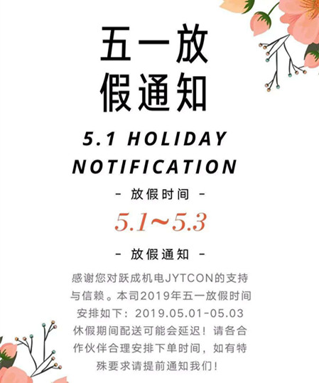 根據2019年國家法定假期的規定,並結合公司實際情況,宅男宅女网(躍成機電)現對五一節放假做如下安排: